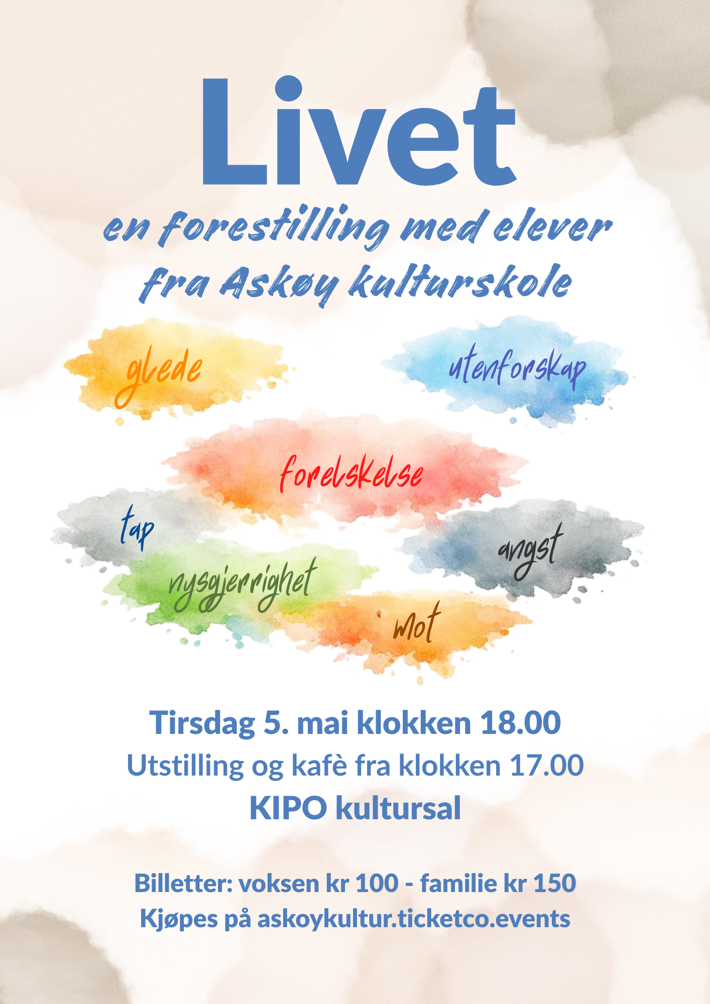 Fra kl. 17.00 blir det kafe og utstilling i foajeen og kl 18.00 starter forestillingen i KIPO kultursal. Det blir kafe i pausen til forestillingen. Vel møtt!